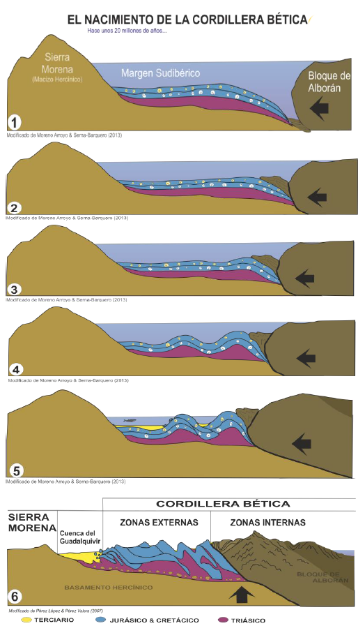 Hace unos 65 millones de años, cuando la Era Secundaria está a punto de finalizar, la placa tectónica africana comenzó a desplazarse hacia el norte para luego chocar con la placa europea, introduciéndose debajo de ella. Se trata de los movimientos orogénico alpino, que se extenderían durante el Oligoceno y el Mioceno. Los materiales depositados en el fondo del mar de Thetys fueron sometidos a fuertes presiones hasta que emergieron. El fondo de este mar había comenzado a plegarse hace unos 50 millones de años; hace unos 25, emergería formando un archipiélago. Estos empujes formaron pliegues y sobre todo, como el empuje fue mayor, estos fueron desplazados hacia el Norte constituyendo cabalgamientos sobre el resto de los materiales. También debajo de los materiales del Subbético existía una capa de margas yesosas del trías que favorecieron los cabalgamientos. Al final del Mioceno (cinco millones de años), se retiraron definitivamente las aguas y la base rocosa de las Sierras Subbéticas quedaron expuestas a la acción de los agentes geológicos externos. Estos modelaron su aspecto actual, al igual que resultó de la acción de los cinco periodos fríos del Cuaternarios, ya que durante el último de estos (Würm) las nieves perpetuas llegarían los 1000 metros sobre el nivel del mar.