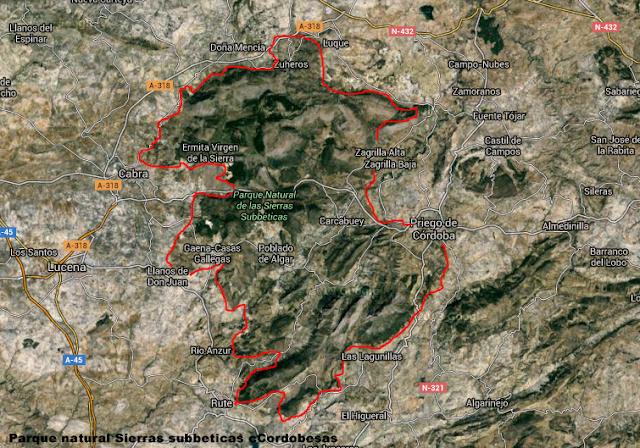 El Parque Natural de las Sierras Subbéticas, declarado parque natural en 1988, se encuentra situado en la parte sur de la provincia de Córdoba y en pleno centro de Andalucía, formando parte de las cordilleras Béticas. Su superficie abarca 31 568 hectáreas de terreno repartido entre los municipios de Cabra, Carcabuey, Doña Mencía, Iznájar, Luque, Priego de Córdoba, Rute y Zuheros. Fue declarado “Sitio de Interés Natural” en 1927 por la Junta Central de Parques nacionales tras la visita de campo realizada por los geólogos reunidos en Madrid en el XIV Congreso Internacional de Geología (1926), que inició la promoción de su estudio y protección. En 2006, fue reconocido por la UNESCO como geoparque de España, e incluido en la red europea de geoparques (European Geoparks Networks) con el nombre Geoparque Sierras Subbéticas (Subbeticas Geopark), junto a otra treintena de espacios protegidos. Como principales instalaciones de atracción turística, el parque cuenta con un centro de visitantes (Santa Rita), un ecomuseo (Cueva de los murciélagos), varios miradores y nueve senderos. La geología se establece como base para introducir la diversidad biológica, arqueológica y cultural del área.