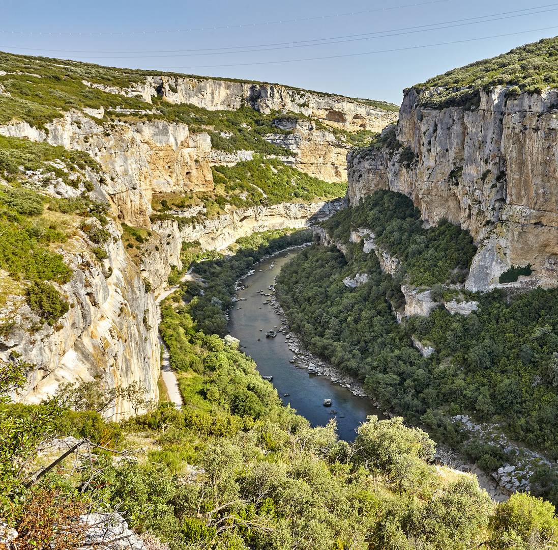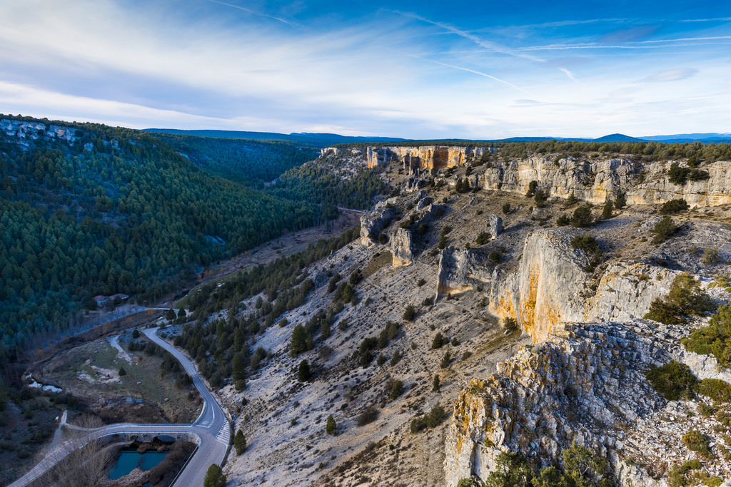 - Cañón. Es un valle de gran profundidad, paredes verticales, trazado rectilíneo y escasa anchura. Los cañones conforman profundas tajaduras en los macizos calizos, en ocasiones, con características meandriformes que, en España reciben el nombre de hoz. Ejemplos, la Foz de Lumbier (Navarra), las hoces del río Duratón (Segovia), las Hoces del río Júcar (Cuenca y Albacete), etc.