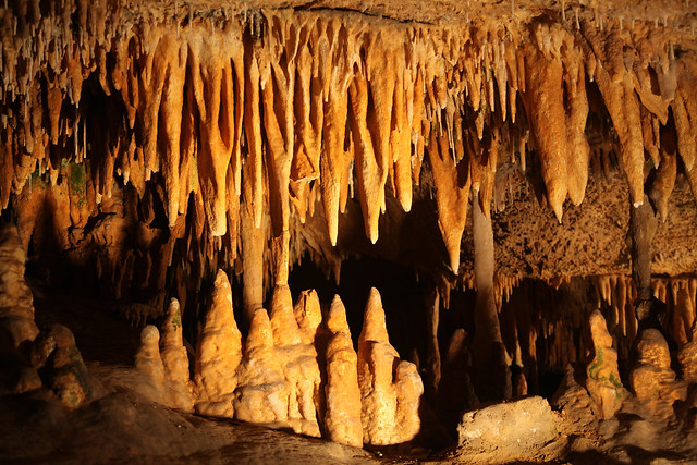 - La precipitación del material disuelto en las aguas carbonatadas puede originar la formación de estalactitas (acumulaciones que se forman a partir del techo de la cueva) y estalagmitas (acumulación iniciada en el suelo de la cueva. Cuando se produce la unión de ambas se forma una columna.