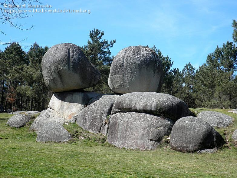 - En los climas templados el paisaje granítico característico es el berrocal con acumulación de bloques graníticos redondeados (bolos) que pueden aparecer apilados.
