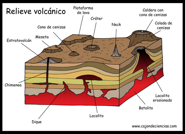 Las formas de relieve de áreas volcánicas son fruto de la irrupción de materiales procedentes del interior de la Tierra (magma) y dan lugar a paisajes cambiantes al ser rocas recientes. Canarias es el territorio volcánico por excelencia, si bien son también reconocidos otros paisajes volcánicos como los de Olot, sudeste de España (Cabo de Gata), Campo de Calatrava, etc. Las formas más destacadas son los conos de piroclastos, las calderas volcánicas, algunas son fruto del hundimiento de la cámara magmática, las coladas de lava o malpaís, etc.