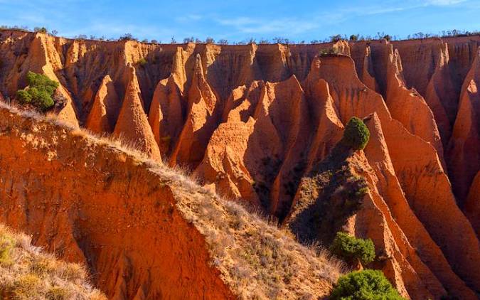 Las rocas arcillosas, margosas o areniscas son más blandas y, por consiguiente, más fáciles de erosionar que, en condiciones climáticas áridas y semiáridas, con escasa cubierta vegetal, las precipitaciones de alta intensidad pueden modelar un paisaje de surcos, cárcavas y barrancos, denominado badlands. Este tipo de formaciones son típicas de las depresiones y cuencas terciarias intrabéticas y pirenaicas y algunas de estas áreas han sido declaradas de interés singular, como es el paraje de Barrancos de Gebas en Murcia.