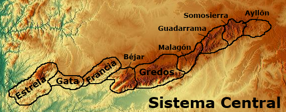 El Sistema Central se estructura en varios conjuntos. La Sierra de Gata y la Peña de Francia forman el conjunto más occidental y no superan los 1.800 m de altitud. La Sierra de Credos y la de Guadarrama se sitúan en el centro y sus cimas más altas superan los 2.400 metros. En el extremo oriental se disponen las sierras de Somosierra, Ayllón y la Pela. Es una unidad larga (700 km) y muy estrecha. Presenta una cierta simetría de este a oeste, dado que se va elevando desde los extremos hacia el centro, donde alcanza su máxima altitud: el pico Plaza del Moro Almanzor (2.591 m), en la Sierra de Gredos. La vertiente norte, del Duero, es más suave, y la vertiente sur, la del Tajo, es más abrupta.
