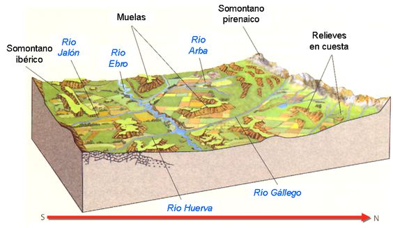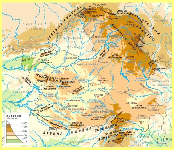 - En la cuenca del Tajo, de este a oeste, encontramos los páramos de La Alcarria y la Mesa de Ocaña, y extensas campiñas, como las de La Sagra. Hacia el oeste el río Tajo se encaja hasta alcanzar los 200 m en la frontera con Portugal.