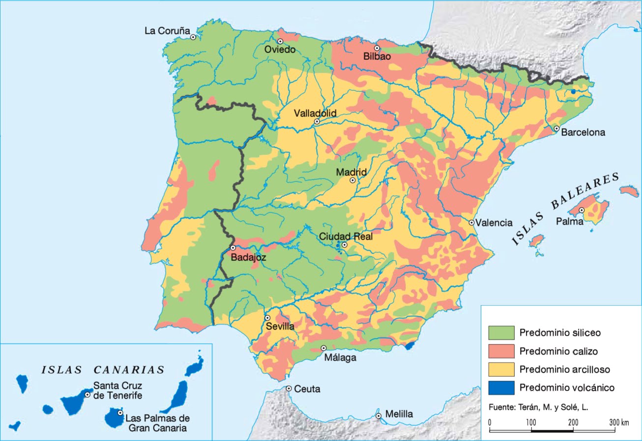 c) ¿Qué relación básica guarda cada uno estos dominios litológicos en la Península con los distintos usos agro-forestales del territorio? (Hasta 2 puntos).