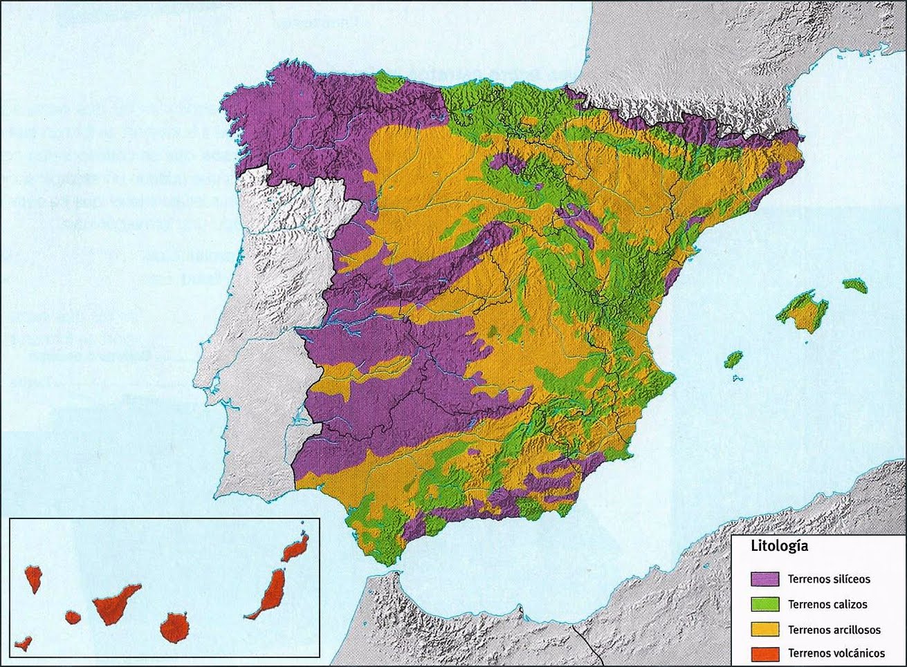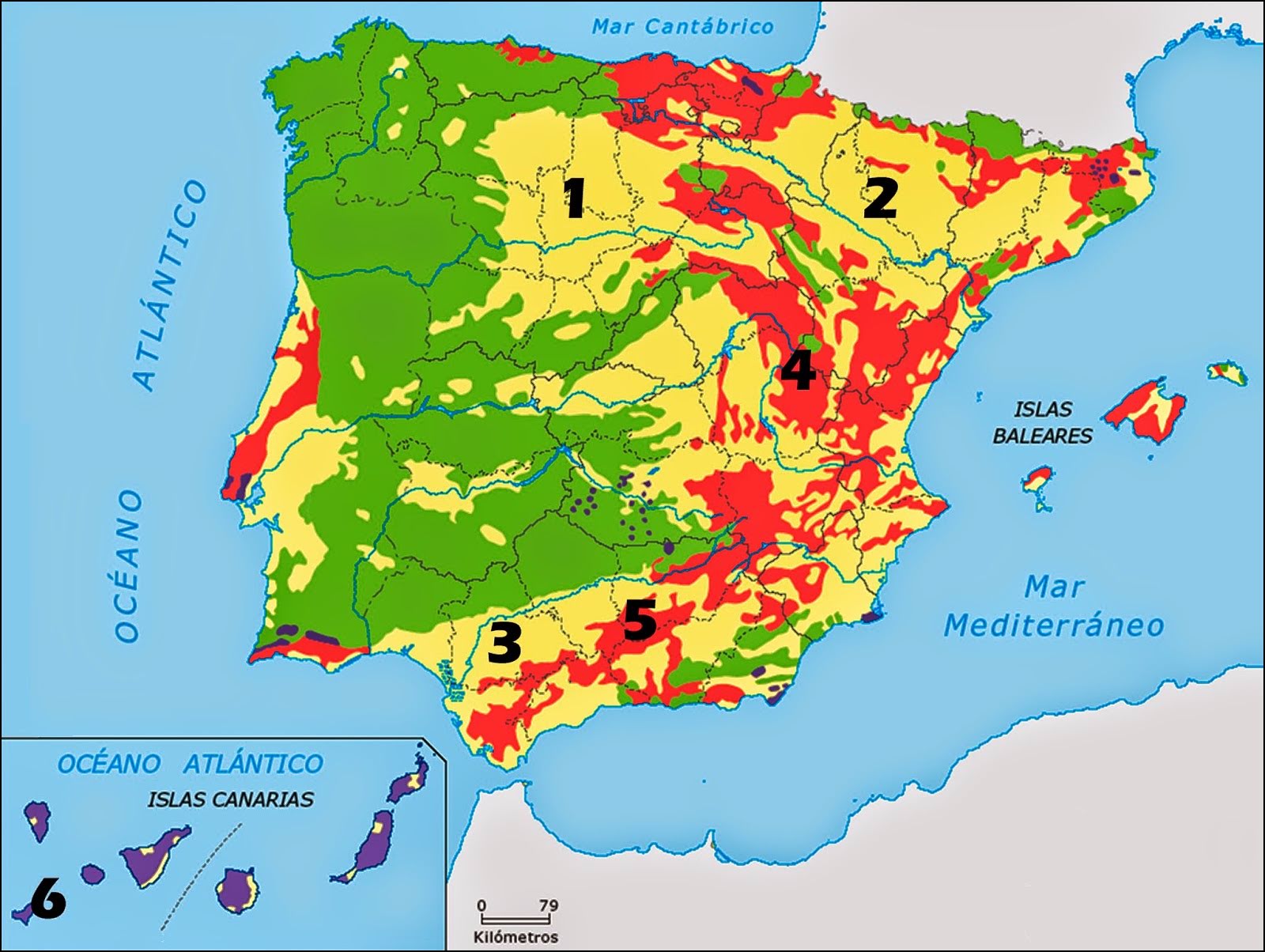 El mapa representa el roquedo de la Península Ibérica. Analícelo y responda a las siguientes preguntas: