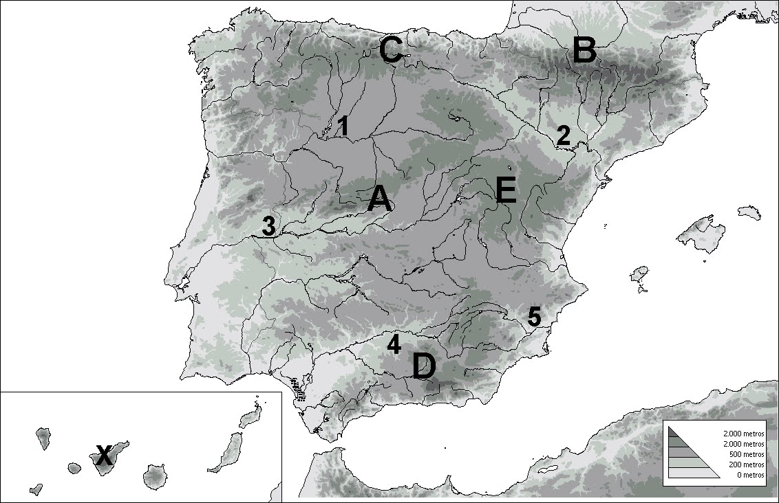 La siguiente figura corresponde al mapa físico de España. Obsérvelo y conteste a las preguntas siguientes: