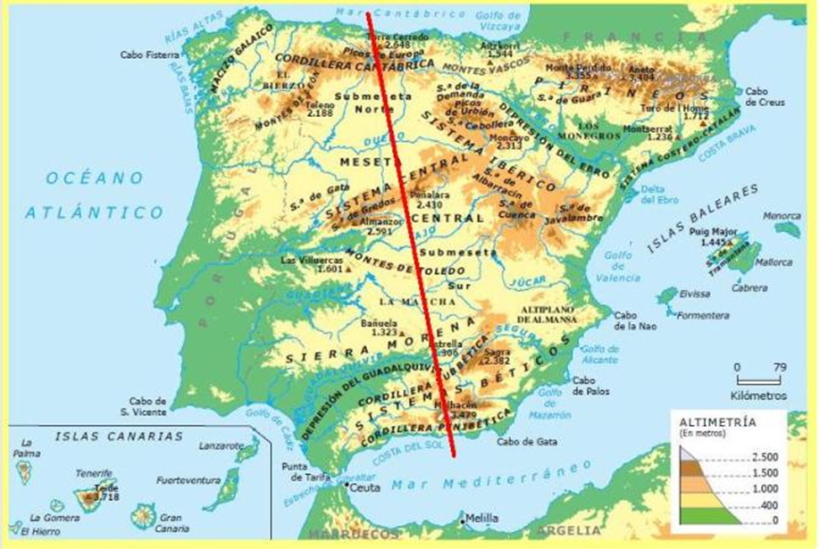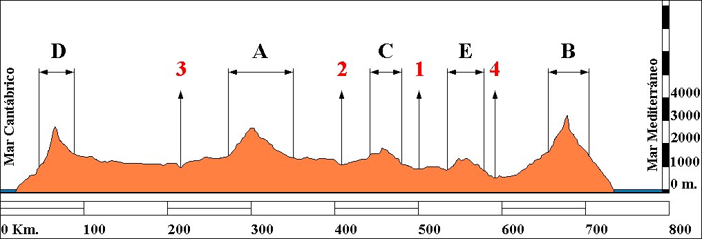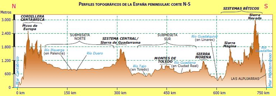 En el gráfico se representa un perfil topográfico de la Península Ibérica desde el Mar Cantábrico al Mar Mediterráneo. Analícelo y conteste a las preguntas siguientes: