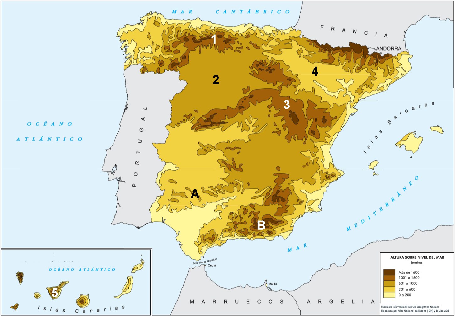 A continuación se presenta un mapa de altitudes sobre el nivel del mar de España. A partir del mismo responda a las siguientes cuestiones: