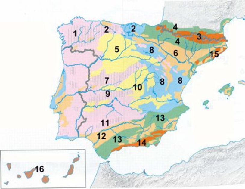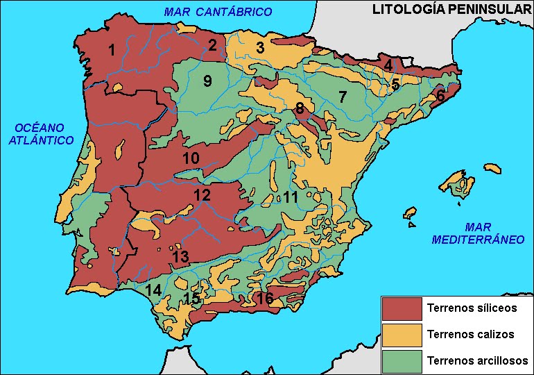 - c) Partiendo de los tres principales tipos de roquedo de la Península Ibérica, nómbrelos con los números que cada uno de ellos tiene superpuestos. ¿Qué rocas predominan en el 16?