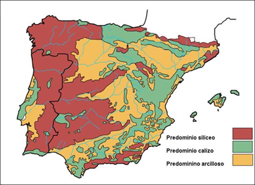 b) Describa la distribución de la litología arcillosa en España y justifique su presencia en esas partes del relieve (Hasta 1 punto).