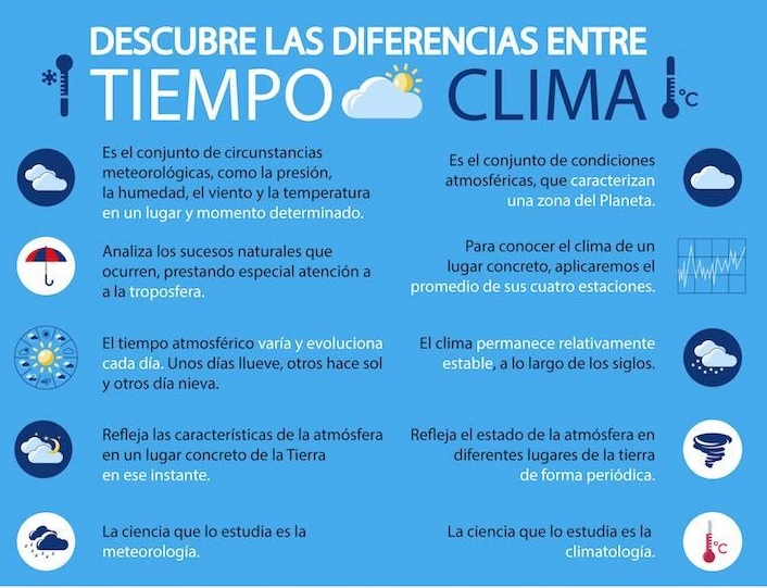 Tampoco hay que confundir los conceptos de TIEMPO y de CLIMA. Tiempo es la combinación local y pasajera de temperatura, presión y humedad; cada masa de aire origina un tipo de tiempo determinado. La sucesión habitual de tipos de tiempo en un sitio determinado en el transcurso del año da lugar al Clima.