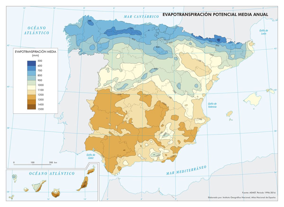 - La España seca es un área muy amplia delimitada, por las isoyetas de 300 y 800 mm anuales, y abarca el 72% del territorio peninsular. Incluyendo las dos submesetas, los valles del Ebro y del Guadalquivir, zonas de Levante y Cataluña, y la mayor parte de los archipiélagos. Las causas de la disminución de las precipitaciones son, por un lado, el debilitamiento de los flujos atlánticos a medida que penetramos hacia el interior de la Península; y por otro, cuanto más al sur, mayor es la influencia del mundo tropical. El paso de la España húmeda a la España seca se realiza a través de una zona de transición, delimitada por las isoyetas de 600 a 800 litros anuales, se extiende formando una aureola por la vertiente meridional de los Pirineos, Cordillera Cantábrica y el sector occidental de ambas mesetas.