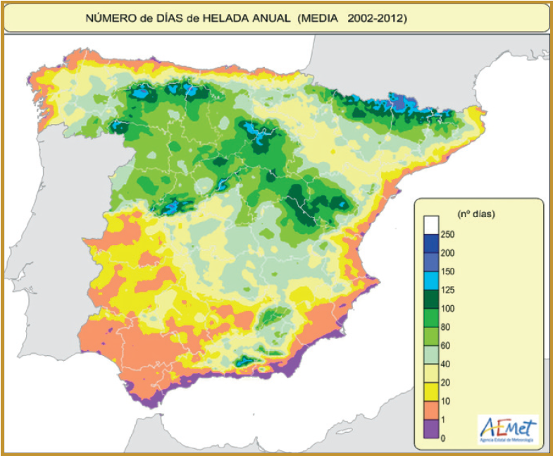 Otros dos aspectos importantes de las temperaturas en relación con el clima son la amplitud térmica anual y las heladas. Las heladas se producen cuando la temperatura de aire baja de 0ºC (bajo cero). Prácticamente toda la Península corre el riesgo de tener un día de helada al año; las heladas son muy frecuentes en la Meseta -Submeseta Norte (más de 80 días)-, La Mancha (entre 60 y 80 días), en el Valle del Ebro y en los sistemas montañosos -en puntos de los Pirineos (100 días)-. El menor número de heladas se da en las costas, porque la influencia del mar suaviza las temperaturas; se generan excepcionalmente en costa del Norte y NO y casi nunca en Costa del Sol.