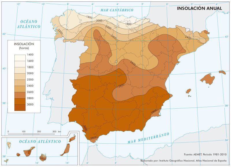 La insolación es la cantidad de radiación solar que recibe la superficie terrestre. España, por su latitud, recibe gran cantidad de energía solar: se superan las 2000 horas de sol anuales. En el mapa de insolación anual, valor que se obtiene a partir del número de horas de sol registradas a lo largo del año, se observa que la insolación aumenta de forma bastante regular de norte a sur. En Galicia, Cantábrico y alto Ebro es menor, de 1.600 a 2.000 horas. Los valores más altos de insolación se dan en Badajoz, Sevilla, Almería y Alicante. En Baleares los valores de insolación están cerca de las 2.800 horas en Mallorca, y 2.600 horas en Ibiza y Menorca. En Canarias, debido a la nubosidad ligada a los vientos alisios, el número de horas de sol es variable según las islas. El máximo de insolación se da en verano y el mínimo en invierno.