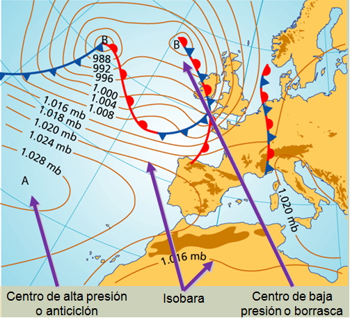 La presión atmosférica es el peso del aire sobre una unidad de superficie. Esta presión se mide mediante el barómetro, se expresa en milibares (mb) y se representa en los mapas del tiempo mediante las isobaras que son líneas que unen puntos con igual presión. La presión normal es de 1013,5 mb. Una alta presión o anticiclón es una zona de altas presiones: el aire pesa mucho, más de 1016 mb.; en un anticiclón los vientos circulan a su alrededor en el sentido de las agujas del reloj y no se forman nubes; el resultado es un tiempo estable. Una baja presión, depresión o borrasca, es una zona de bajas presiones; los vientos circulan a su alrededor en sentido inverso al de las agujas del reloj; produce tiempo inestable y frecuentemente lluvioso. En España en invierno dominan las altas presiones; en otoño y primavera las bajas; y en verano, nuevamente las altas, aunque en el interior de la Meseta se producen en verano bajas presiones de origen térmico, por el calentamiento del aire debido al recalentamiento del suelo.