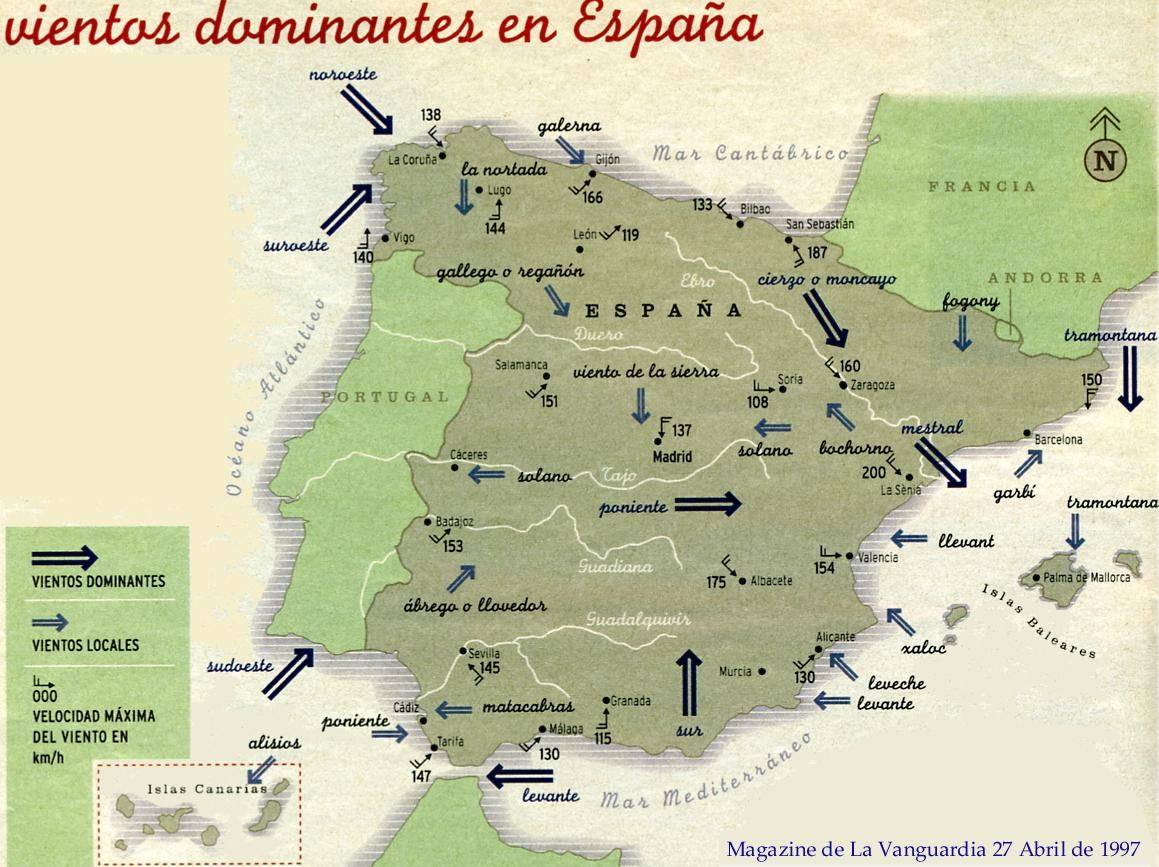 Los vientos son movimientos horizontales del aire que se producen por las diferencias de presión y van desde las altas a las bajas presiones. En los mapas del tiempo la cercanía de las isobaras indica la fuerza del viento: a más cercanía más fuerza. Son muy variados en función de la circulación general de la atmosfera y de alteraciones de carácter local. En toda la costa occidental y regiones aledañas se deja sentir el efecto de la circulación general zonal del oeste, apoyada por la circulación atmosférica en altitud (corriente en chorro), de manera que predominan los vientos del oeste. En las regiones orientales abundan los vientos de componente este, reflejo de las bajas presiones instaladas en el Mediterráneo. En las franjas septentrional y meridional peninsulares son frecuentes vientos de componente norte-noreste y sur, respectivamente, ligados a centros de acción de Eurasia y África. Por su parte, las islas Canarias se encuentran en la trayectoria de los alisios. Pero, además, hay que prestar atención a los vientos locales (Cierzo en Aragón, Levante en Valencia o Estrecho de Gibraltar, Tramontana en las Baleares), muy influidos tanto por los centros de acción como por las características topográficas de cada sector, con los consiguientes efectos barrera, de encauzamiento o de desviación.