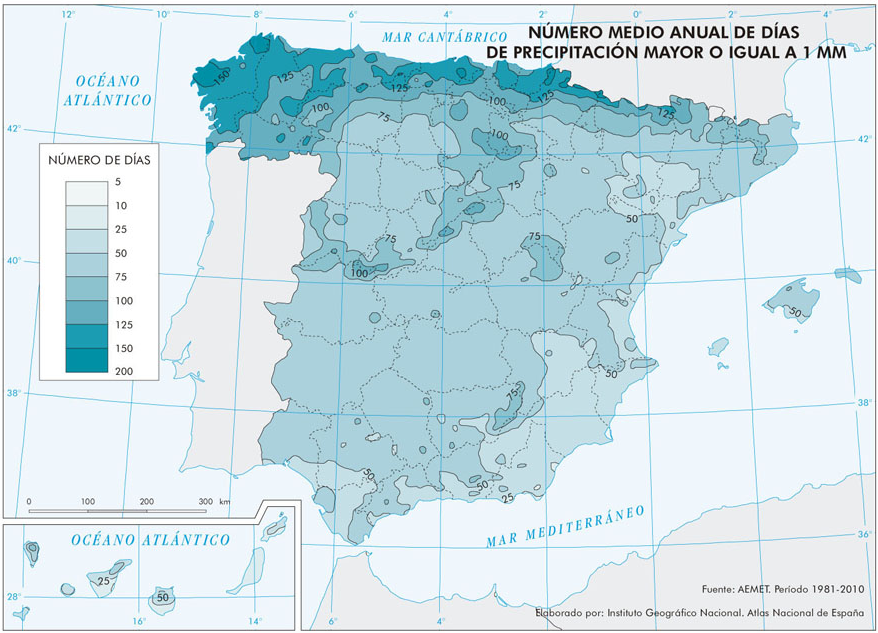 - La España húmeda es la única que recibe precipitaciones anuales abundantes, siempre superiores a los 800 litros, aunque existen puntos que superan los 2000 litros. Comprende las vertientes noroeste y norte peninsular, desarrollándose en una franja continua que va desde Galicia hasta Cataluña, incluyendo también las zonas montañosas de esa vertiente norte: los macizos Galaico y Cantábrico y los Pirineos. Las causas de la elevada pluviometría de estas áreas hay que buscarlas en su disposición septentrional, con la consiguiente influencia de las borrascas y de los frentes atlánticos, y en el relieve. Fuera de estas áreas, sólo algunos núcleos aislados de la Península reciben precipitaciones totales anuales similares, conformando auténticos islotes de humedad en medio de zonas más secas. En este caso, la altitud es la causa fundamental de las abundantes precipitaciones, de ahí que su distribución esté estrechamente relacionada con las áreas montañosas de la Península: sectores de la Penibética, zonas más elevadas de la Cordillera Ibérica, las sierras de Cazorla y Segura, y puntos muy localizados de los Montes de Toledo y Sierra Morena. Dentro de esta área merecen destacarse la sierra de Grazalema, la más lluviosa de España, que recibe más de 2000 litros anuales, explicable por el efecto orográfico, la distancia al mar, su posición respecto a los vientos húmedos con diferencia entre barlovento y sotavento, y la sierra de Gredos , que supera ampliamente los 1500 litros.