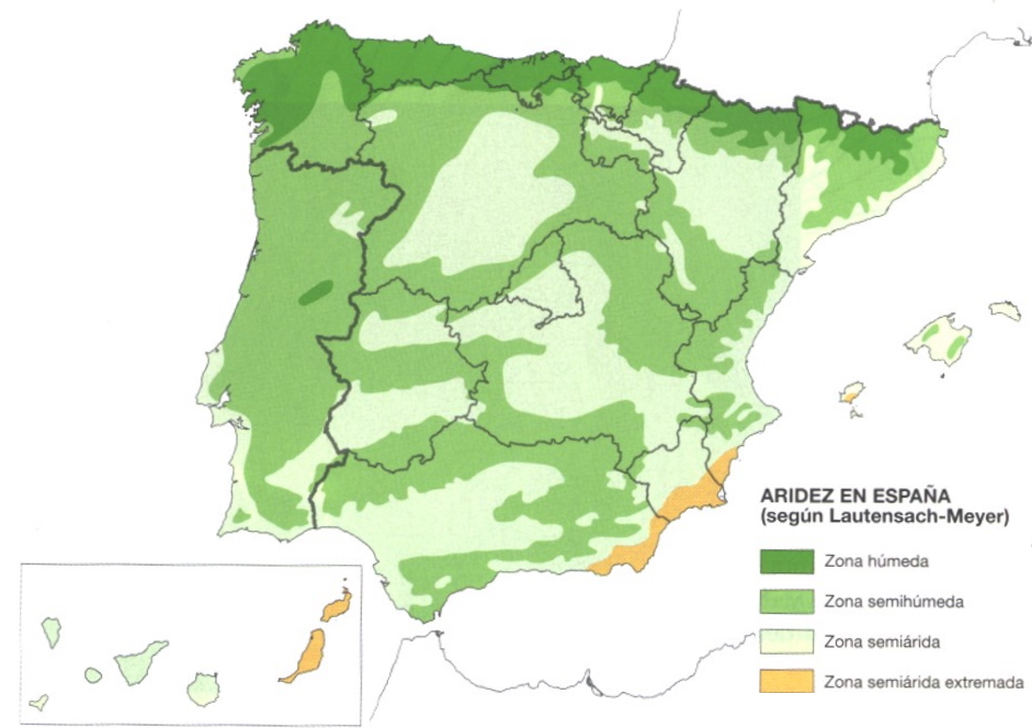 - El índice de Lautensach-Meyer determina la aridez general de una zona, a partir del número de meses con déficit de agua (menos de 30 mm de precipitación). Se habla entonces de zona sin aridez o húmeda (ningún mes con déficit de agua y exceso notable de agua en el suelo); zona semihúmeda (de 1 a 3 meses áridos, existe todavía algún exceso de agua; zona semiárida (de 4 a 6 meses áridos, ya no existe superávit de agua), y zona semiárida extremada (de 7 a 11 meses áridos). En España no hay regiones totalmente áridas (todos los meses con precipitaciones inferiores a 30 mm.).