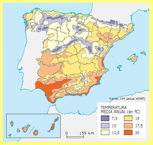La temperatura es el grado de calentamiento del aire por la acción de los rayos solares. Se representa en los mapas mediante isotermas (líneas que unen los puntos con igual temperatura). Junto con las precipitaciones es el otro elemento fundamental para la caracterización básica de los climas. En una primera aproximación, si observamos las temperaturas medias anuales de las distintas zonas de España, apreciamos que existen grandes contrastes entre unas y otras. Estos pueden explicarse atendiendo a varios factores como son: