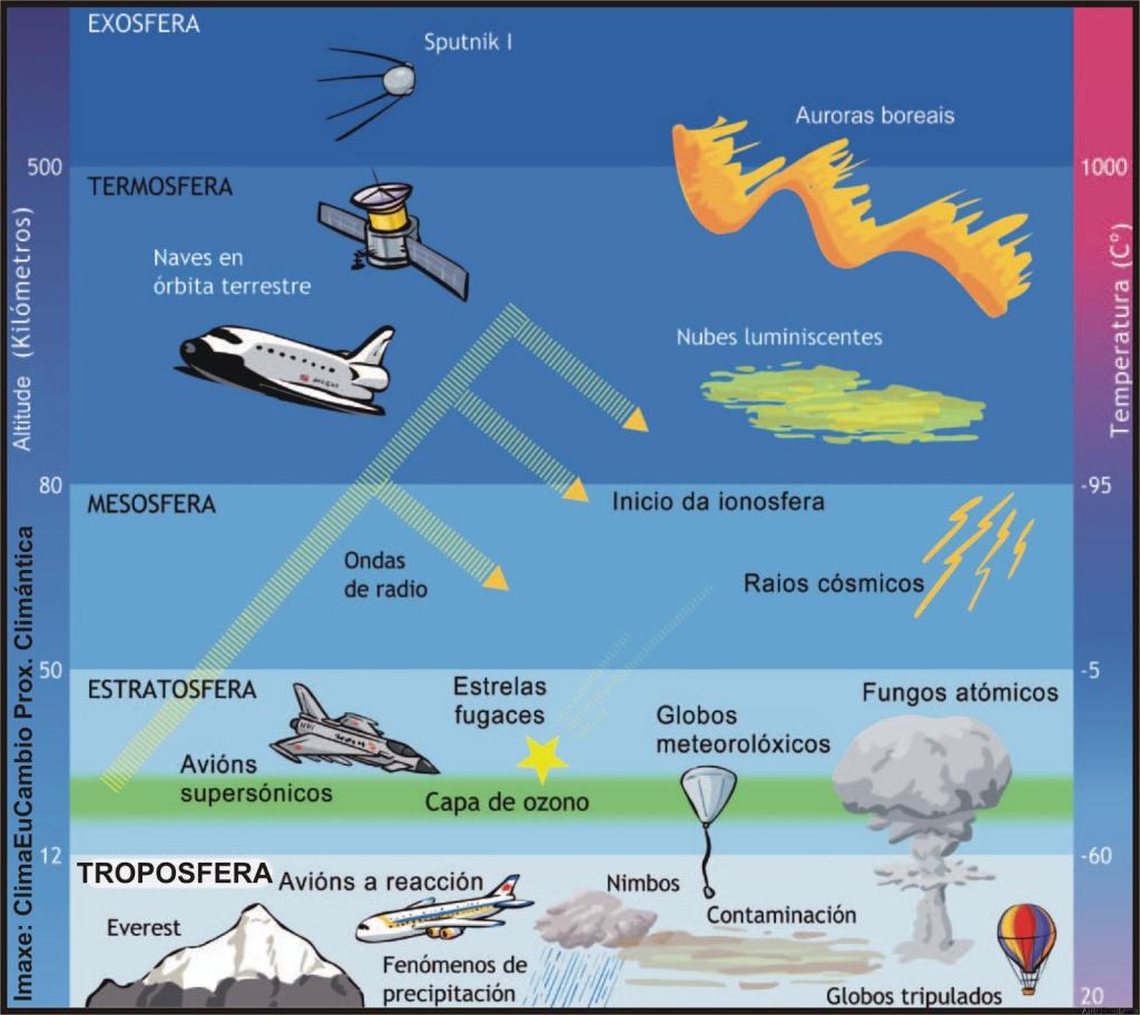 1. TROPOSFERA, localiza en la Homosfera, (desde el nivel del mar hasta los 12 Km aproximadamente de altura) en la que tienen lugar todos los fenómenos climáticos que estudiaremos después. Se caracteriza por: