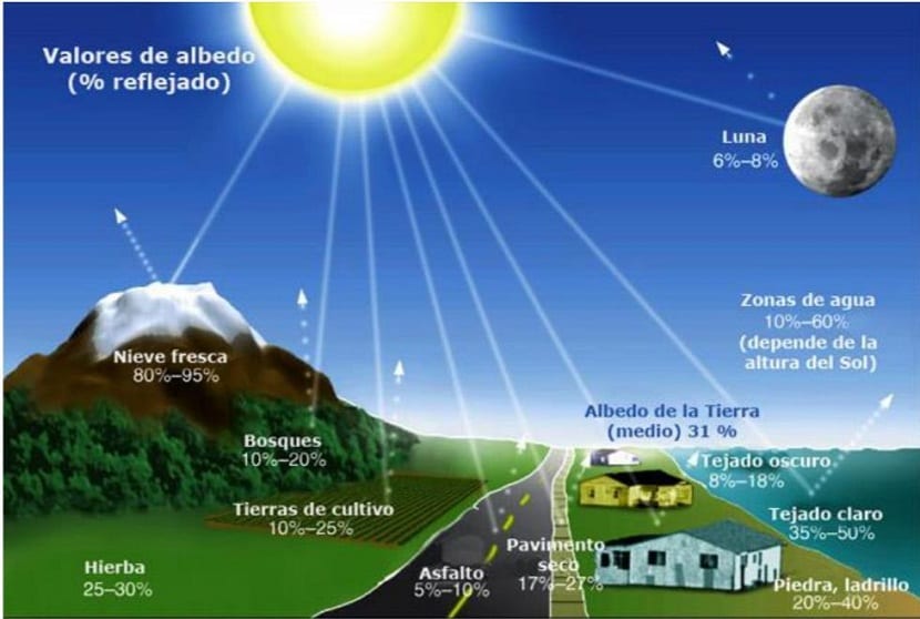 - a) Insolación: es la cantidad de energía solar que recibe un lugar. La variación de insolación se constata en una disminución de Tª media a medida que nos acercamos a los polos. La insolación depende de varios factores como son la inclinación de la Tierra, la distancia entre la Tierra y el Sol (es decir, la estacionalidad), la latitud, la nubosidad y la propia atmosfera. Del total de radiación solar que llega a la Tierra, se calcula que tan sólo un 40-45% llega al suelo (es lo que se denomina albedo). El resto es reflejado por la atmósfera o se pierde en ésta.