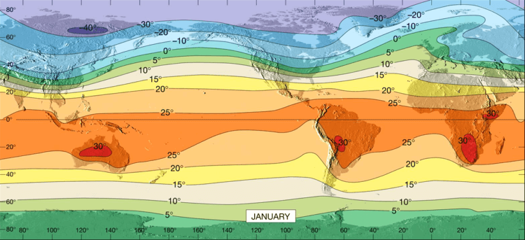 c) Comportamiento diferencial de la tierra y el mar: los océanos se calientan y se enfrían más lentamente que los continentes. En los continentes existe más AMPLITUD TÉRMICA que en los océanos. La amplitud térmica anual (A.T.A.) es la diferencia entre la media del mes más cálido y la media del mes más frío. La A.T.A. es mayor en el Hemisferio Norte que en el H.S. por su mayor continentalidad.