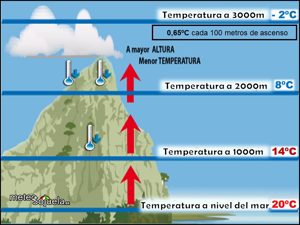 - b) Altura sobre el nivel del mar y la exposición de la vertiente: la altura es un factor de gran influencia en la temperatura. Se sabe que por cada 100 m que ascendemos, la Tª disminuye 0'65 ºC. Además, en las vertientes expuestas al Sol (solana) se recibe más insolación que las no expuestas (umbría).