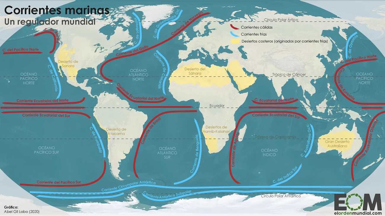 e) Corrientes marinas (consulta el artículo de la Wikipedia): las corrientes marinas son grandes movimientos de masas de agua oceánicas y, en menor medida, marítimas. Estas corrientes se deben al movimiento de rotación de la Tierra, pero también a la influencia de los vientos, la configuración de las costas y del relieve marino. Influyen sobre la Temperatura de los lugares situados en las franjas continentales cercanas a los océanos. Existen corrientes cálidas (Corriente del Golfo de México, la de KURO SHIO) y frías (Corriente del Labrador, la de OYA SHIO).