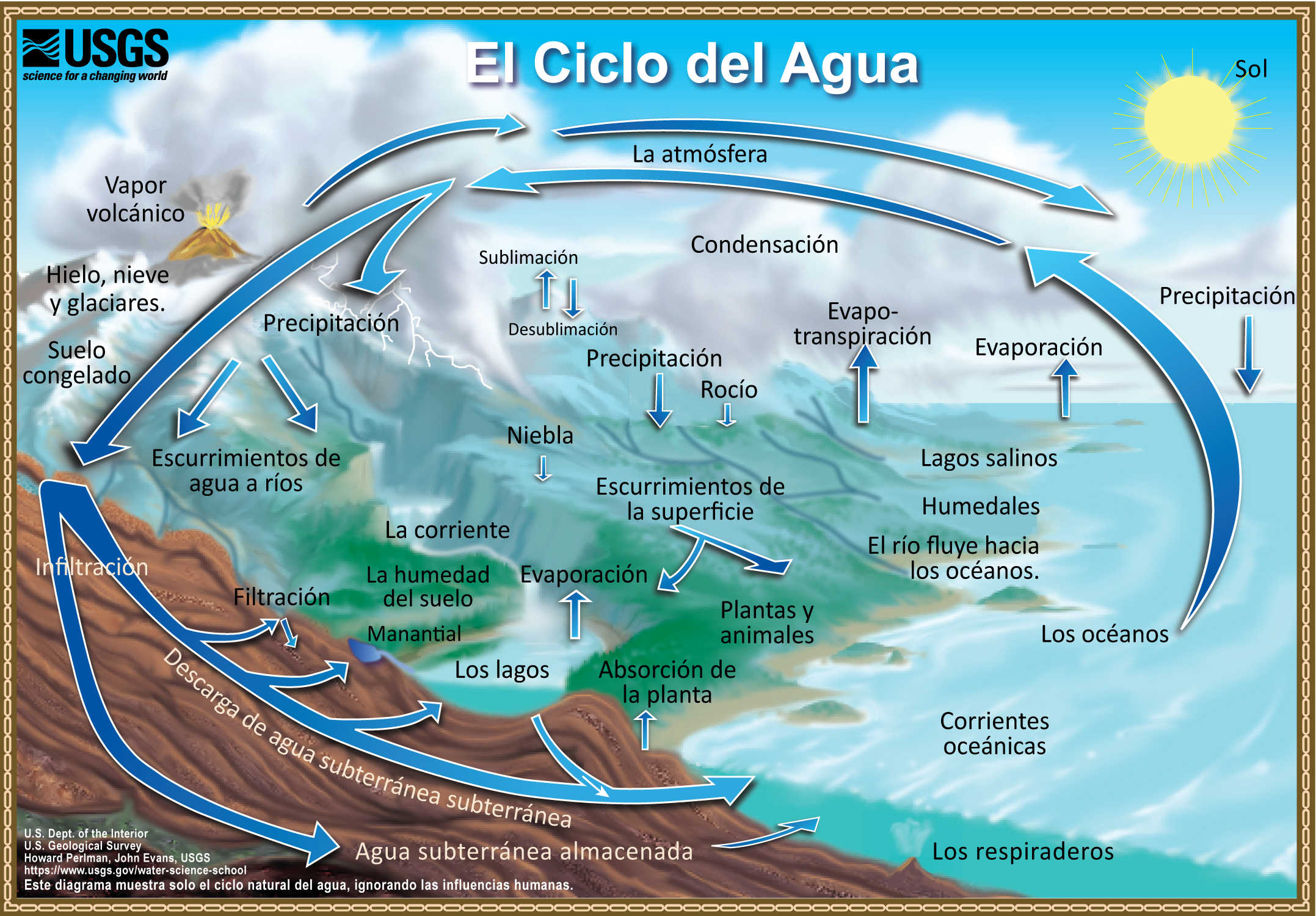 El agua en la naturaleza está en un continuo estado de transformación, pasando de la superficie terrestre a la atmósfera y viceversa, en un proceso que se denomina Ciclo hidrológico o ciclo del agua, cuyas fases son: evaporación, condensación y precipitación.