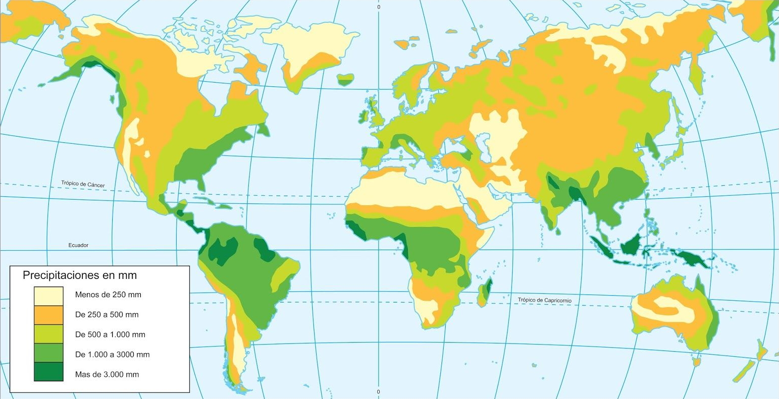 En las latitudes medias los valores de precipitación se encuentran en torno a la media. El resto de las regiones del Planeta se mueven entre estos valores extremos.