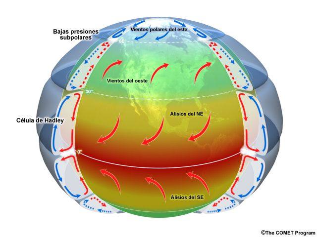 Las diferencias térmicas y de presión sobre la Tierra tiende a equilibrarse a partir de los centros de acción que están en continuo movimiento. Estos centros de acción emiten y reciben vientos que son permanentes a lo largo del año. Este entramado de centros de acción y vientos, tanto en su dimensión horizontal como vertical, recibe el nombre de CIRCULACIÓN GENERAL ATMOSFÉRICA. En síntesis, sería el siguiente mecanismo: el aire se calienta en el Ecuador, se eleva y origina una zona de baja presión que atrae a los alisios. En altura, el aire ecuatorial se dirige hacia los trópicos en el llamado contraalisio que al enfriarse desciende y origina una zona de altas presiones tropicales. Desde esta altura, el viento se dirige hacia el Ecuador (alisios) y hacia las latitudes templadas (los vientos del Oeste). El choque de los alisios procedentes del hemisferio sur y los que tienen su origen en el hemisferio norte dan lugar a la denominada Convergencia Intertropical, que produce el ascenso (enfriamiento) de aire con gran carga de humedad. El resultado es la existencia de fuertes y constantes precipitaciones en la zona ecuatorial.