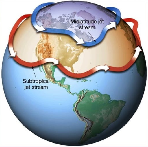 Un elemento de gran importancia en la C.G.A. y, especialmente, en las zonas templadas es la corriente en chorro, o jet strem. La corriente en chorro es un flujo de viento situado en la alta troposfera que circunda el Globo y tiene una velocidad máxima de unos 300 km/ h , una anchura de doscientos kilómetros y un espesor de 8-10 km. Su trayectoria es muy variable y en ocasión es presenta con una trayectoria muy rectilíneo, mientras que, en otras, dibuja unas ondas muy sinuosas y llega incluso a romperse, lo que supone la penetración de masas de aire frío en latitudes medias, lo que origina una “gota fría” o DANA (Depresión Aislada en Niveles Altos) que lleva aparejadas importantes precipitaciones.