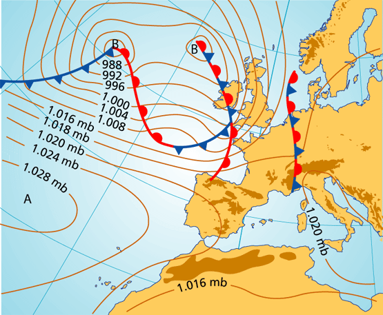 Partiendo de las bajas presiones del oeste de Europa, sistemas frontales cálidos y fríos barren Europa occidental. Un frente cálido roza la cornisa cantábrica. El sistema frontal con centro en Inglaterra se está ocluyendo (el Frente Frío está alcanzando al Frente cálido), mientras el del Atlántico se encuentra en una fase menos avanzada.