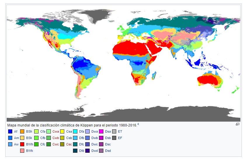 La sucesión de distintos tipos de tiempo sobre un lugar durante un largo periodo de tiempo determina el clima de un lugar. Existe una amplia variedad de clasificaciones climáticas en función de diversos criterios como la finalidad de la clasificación, el elemento predominante, factores ecológicos (como la de Papadakis) o aspectos fisionómicos como la de Köppen. Ésta es una de las utilizadas por los climatólogos. Consiste en una clasificación climática natural mundial que identifica cinco tipos de clima principales, subdivididos en un total de treinta clases con una serie de letras que indican el comportamiento de las temperaturas y precipitaciones que caracterizan cada clima y con ello el tipo de vegetación existente en ellas. anual. Köppen utiliza letras mayúsculas para identificar grandes grupos de climas: