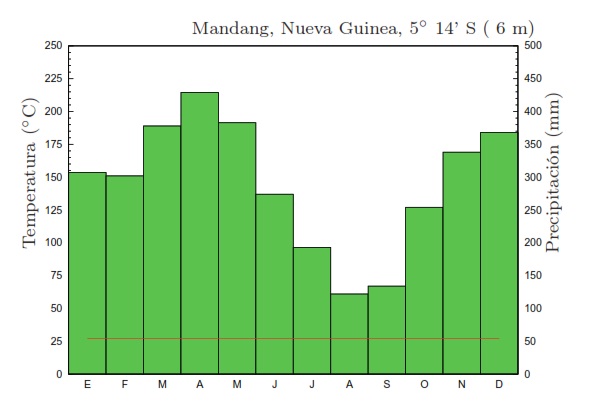 - b) Tropical: Posee elevadas temperaturas todo el año, entre 25 y 27º C, con mayor amplitud térmica que el anterior pero que no suele superar los 20º de diferencia entre el mes más frío y el mes más cálido. Tiene abundantes lluvias (más de 2.00 l/m2) pero con dos marcadas estaciones, una seca y otra húmeda. Origina el bosque tropical -la sabana-. Se localiza al N. y al S. de la zona ecuatorial, en la India, Australia, América y en los bordes de los desiertos africanos. Corresponde a los climas As y Aw de la clasificación de Köppen.