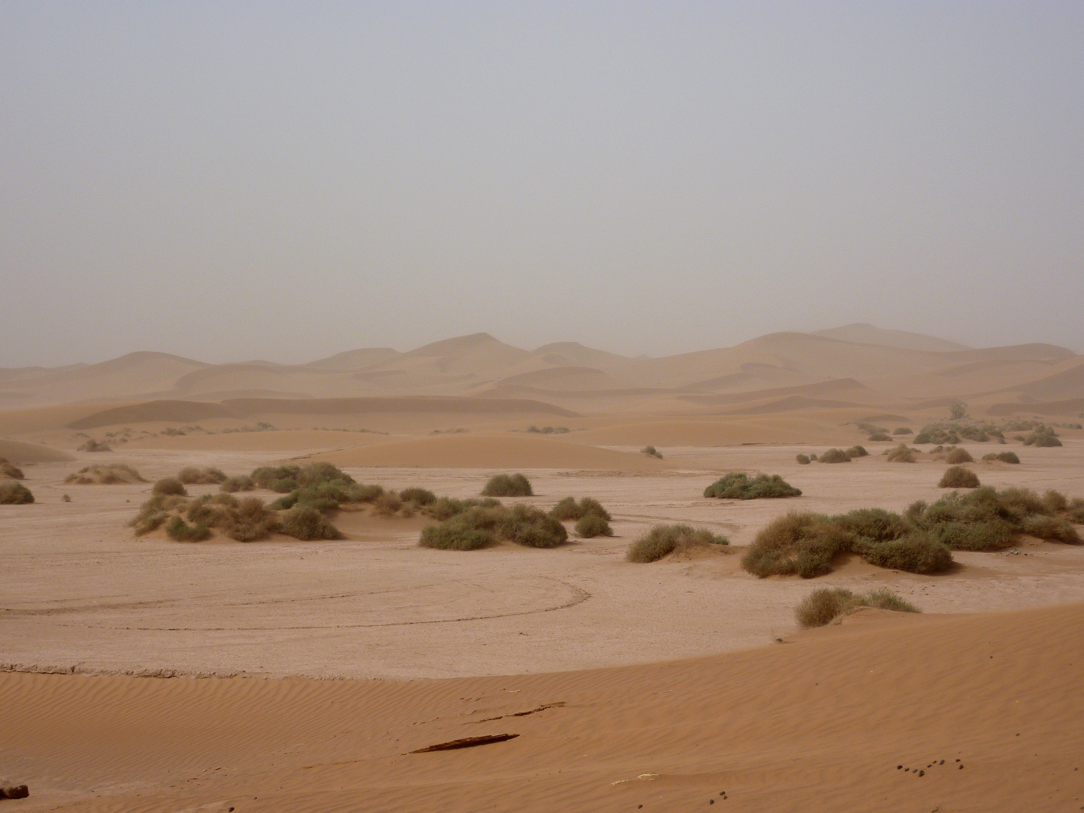 - d) Tropical seco o desértico: Clima cálido caracterizado por las elevadas temperaturas (en torno a 27 ºC de media, pero con una amplitud térmica anual de entre 10 y 18 ºC) y escasas lluvias (menos de 250 mm). Esto se debe a la presencia de altas presiones tropicales durante todo el año. Las temperaturas presentan fuertes oscilaciones diarias (hasta 30º de diferencias entre el día y la noche). Sin apenas vegetación, salvo en los oasis. Se localiza en el Sahara, Próximo Oriente, Norte de México, Centro de Australia, etc. Corresponde con el clima BWh de Köppen.