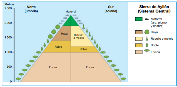 - b) Clima de montaña: Las montañas tienen climas diferenciados al clima general en el que se sitúan, pero los centros de acción y las masas de aire que les afectan son los mismos que este clima general. La altitud introduce modificaciones en los comportamientos normales de las masas de aire. Así, no se debe de hablar de un clima de montaña sino de diversos climas de montaña, uno por cada clima general en el que nos encontremos. Como ya vimos, cualquier masa de aire, a media que asciende por una ladera pierde temperatura 1º por cada 100 metros). Esto supone que a medida que asciende por las laderas de una montaña va aumentando su humedad relativa hasta alcanzar su punto de saturación y precipitar (Efecto Föehn). De esta manera las montañas tienen una media de precipitaciones anuales mayor que el clima general, y unas temperaturas medias mensuales, menor que el clima general. Pero las diferencias de los climas de montaña no se reducen a unas temperaturas menores y unas precipitaciones mayores. Debido a la peculiar disposición del relieve se distingue una vertiente de solana, la orientada hacia las latitudes bajas, y una vertiente de umbría, la orientada hacia las latitudes altas. La vertiente de umbría tiene temperaturas medias menores que la de solana, y por lo tanto una humedad relativa mayor y unas mayores precipitaciones. Con todos estos efectos en una región montañosa aparecen infinidad de topoclimas y microclimas, que afectan a una ladera, a un valle, a una cumbre, o a un lugar concreto. La variedad de tipos climáticos en cada lugar de una región montañosa provoca la aparición de una distribución de la vegetación característica; que en sentido vertical se llama cliserie. Corresponden a los climas H de Köppen.