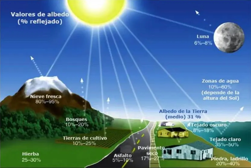 Es la parte de la energía de la irradiación reflejada o difundida por un cuerpo. La atmósfera filtra los rayos solares y por término medio retiene el 57% de la energía; en la capa superior de la atmósfera se refleja aproximadamente un 40%, y un 10% del flujo solar es reflejado por la superficie del suelo.