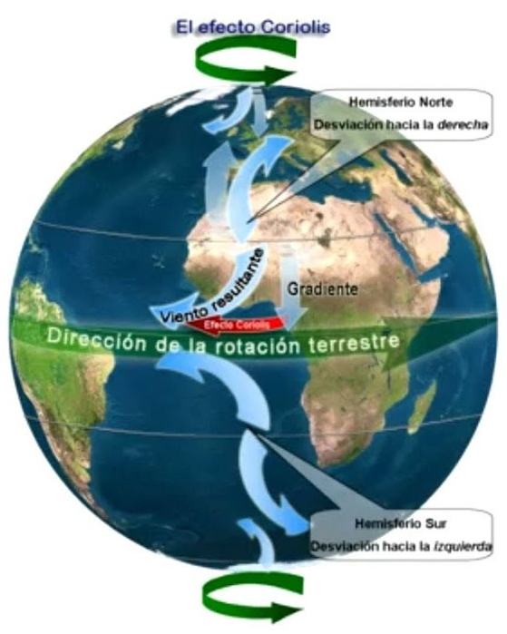 También se denomina geostrófica o fuerza desviadora de la Tierra. No se trata de un fuerza real, sino ficticia o aparente, que se introduce para justificar las consecuencias del torbellino absoluto, cuya existencia evidenciaría, unos años después, en 1851, León Foucault, con su célebre experimento, basado en la invariabilidad del plano de oscilación del péndulo. Coloquialmente se dice que la Fuerza de Coriolis desvía los móviles hacia la derecha en el hemisferio norte y hacia la izquierda en el hemisferio sur. Dicha oposición no es sino consecuencia del torbellino absoluto, cuyo sentido de giro es contrario al de las manecillas del reloj en el hemisferio septentrional y conforme con él en el meridional. Todo lo relativo a la superficie terrestre se ve solidariamente afectado por dicho giro, sean coordenadas geográficas o isolíneas climáticas. Viene dada por la fórmula AC=2V v sen a, siendo V la velocidad el móvil, v la velocidad angular de la Tierra y a la latitud considerada. El torbellino absoluto y, con él, la Aceleración y Fuerza de Coriolis son inexistentes, con valor cero, en el ecuador. Por el contrario, la velocidad del torbellino absoluto es máxima en los polos, donde coincide con la angular del planeta; en función de ello, y a igualdad de otras condiciones, la Aceleración y Fuerza de Coriolis resultan asimismo máximas a 90º de latitud.