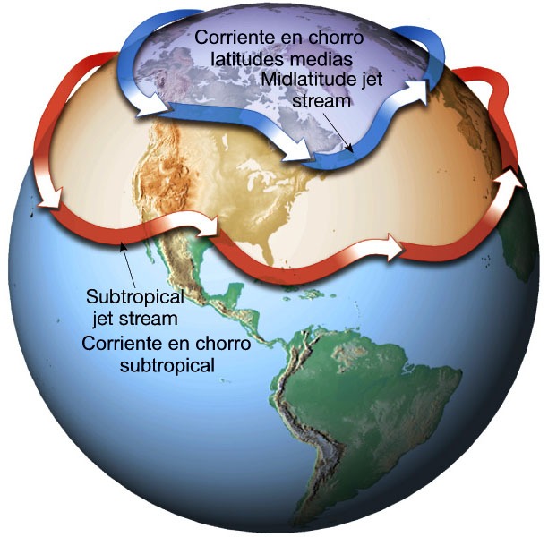 También se denomina o “Jet Stream" en inglés. Se alude así al flujo de vientos que circulan a gran velocidad por el límite de la troposfera. Este flujo de vientos circula de Oeste a Este, a una altitud aproximada de 9.000 metros, con velocidades que oscilan entre los 150 y 600 km/h. Se localiza a unos 40° de latitud, pero oscila latitudinalmente a lo largo de las estaciones del año, siendo reflejo en superficie del frente polar. Las corrientes en chorro son piezas básicas de la circulación atmosférica planetaria, en particular, de latitudes medias y altas. La Organización Meteorológica Mundial las define como “una corriente fuerte y estrecha, concentrada a lo largo de un eje cuasihorizontal en la alta troposfera o en la estratosfera, caracterizada por fuertes gradientes verticales y laterales en la velocidad del viento y uno o más máximos de velocidad”. Una corriente en chorro tiene una longitud de varios miles de kilómetros, una anchura de cientos de kilómetros y un espesor de varios kilómetros. El gradiente vertical en la velocidad del viento es del orden de 5-10 m/s. por kilómetro y el lateral de 5 m/s por 100 km. La corriente en chorro se presenta centrada sobre una línea de máxima velocidad de viento, al menos 100 km/h en su eje, que supera, con frecuencia, los 300 Km/h.