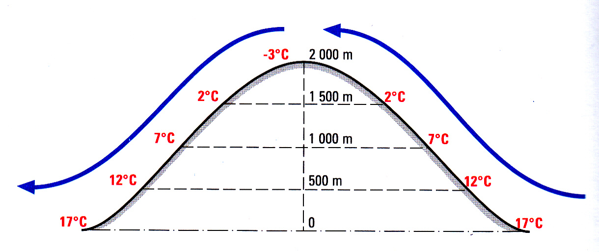 Es el descenso de la temperatura conforme se asciende en altura, a razón de 0,6° centígrados cada 100 metros de ascenso. También se puede expresar como 5° o 6°C / 1000 m. Este fenómeno es otro de los efectos del relieve sobre el clima.