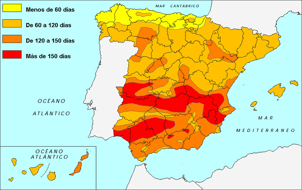 Es la cantidad de radiación solar que recibe la superficie terrestre. Varía en función de la estación del año (en las latitudes medias, como el caso español, es máxima en verano y mínima en invierno) y de la latitud, al determinar ésta la inclinación con la que llegan los rayos solares. En la Península los niveles máximos de insolación se registran en Cádiz, los mínimos se corresponden con la cornisa cantábrica.