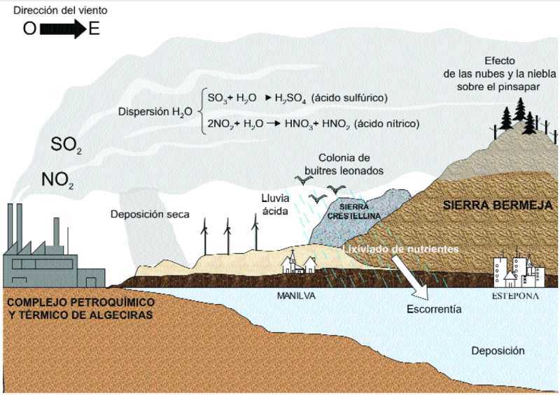 Es una forma de precipitación en la que el agua de lluvia lleva diluidos óxidos de azufre y de nitrógeno dando lugar a una grave forma de contaminación. Está provocada por la emisión de gases a la atmósfera, sobre todo los de las centrales térmicas, de algunas industrias y de las calefacciones domésticas. Las consecuencias son problemas respiratorios en las personas y grandes daños en la vegetación, los cultivos y los suelos. En España la lluvia ácida afecta a algunas zonas de Galicia, Cataluña, Aragón, Valencia y Asturias.