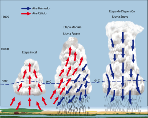 Precipitación debida a movimientos de convección en la atmósfera. Son debidas a un recalentamiento local de las masas de aire que provoca su elevación llevando consigo el vapor de agua que contenía al nivel del suelo. A medida que se elevan, se dilatan y se enfrían; al llegar a determinada altura, condensan su vapor de agua y dan lugar a nubes tipo “cúmulo” que provocaran las precipitaciones.