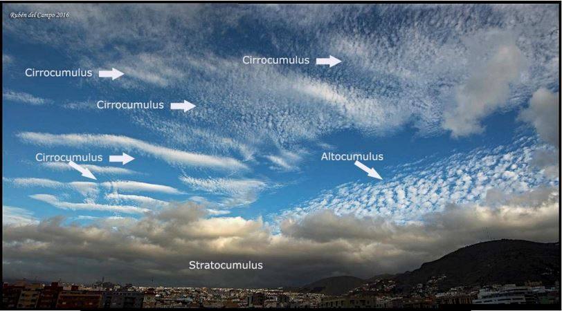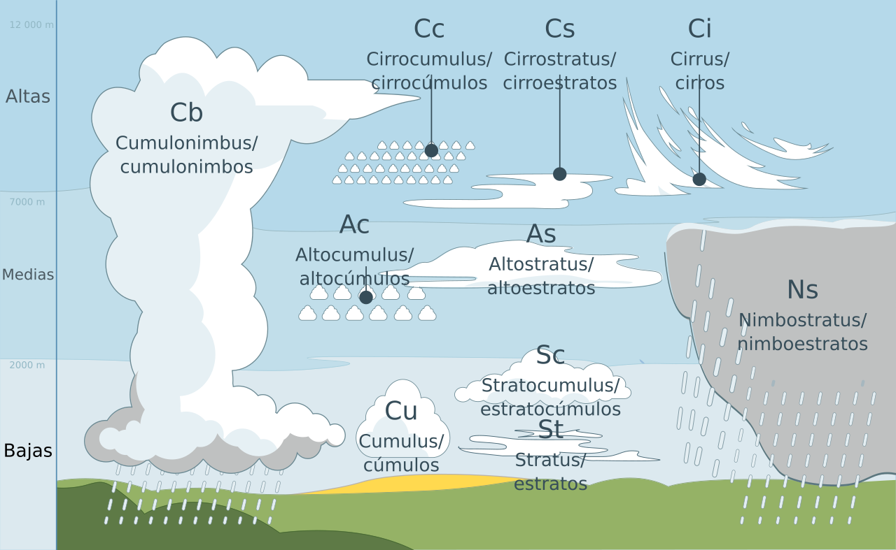 La aparición de nubes supone la transformación en agua o hielo de vapor de agua; hay, en efecto, nubes de agua líquida, de hielo y también de carácter mixto. Esta diversidad de estados se corresponde con la de sus procesos causantes, es decir, condensación, sublimación y congelación. El método taxonómico que se utiliza es la propuesta de Ralph Abercromby y H. Hildebrand Hildebrandsson, adoptada en 1896 por la Organización Meteorológica Internacional. Se identifican cuatro tipos morfológicos y seis combinaciones entre ellos; en total, diez, agrupados, atendida la altitud basal de las nubes, en cuatro familias. Los cuatro tipos morfológicos básicos son: Cirrus (nubes deshilachadas, filamentosas, fibrosas, blanquÍsimas, sin sombra); Stratus (nubes sin formas diferenciadas, en estrato, capa o velo); Cumulus (nubes de cimas redondeadas y globulares, bien recortadas, con sombras) y Nimbus (nubes sombrías y amorfas, con precipitaciones). Mediante la adscripción a familias, se diferencian cuatro grupos, es decir, nubes altas, nubes medias, nubes bajas y nubes de desarrollo vertical. Formas, dimensiones y configuración general permiten distinguir especies; así, en el caso del género Cumulus, se diferencian Cumulus humilis, Cumulus mediocris, Cumulus congestus, Cumulus calvus, Cumulus capillatus, etc. Aspectos más detallados de formas, apéndices o modos en que interceptan o permiten el paso de la radiación luminosa, permiten establecer las variedades. Especial mención ha de hacerse de nubes asociadas a accidentes orográficos, denominadas banderas, capuchones, monteras o tocas, en cuyo desarrollo colaboran eficazmente las brisas de valle diurnas, que las adosa a dichos relieves, mientras las separan o disocian de los mismos las descendentes, en especial las que soplan al amanecer.