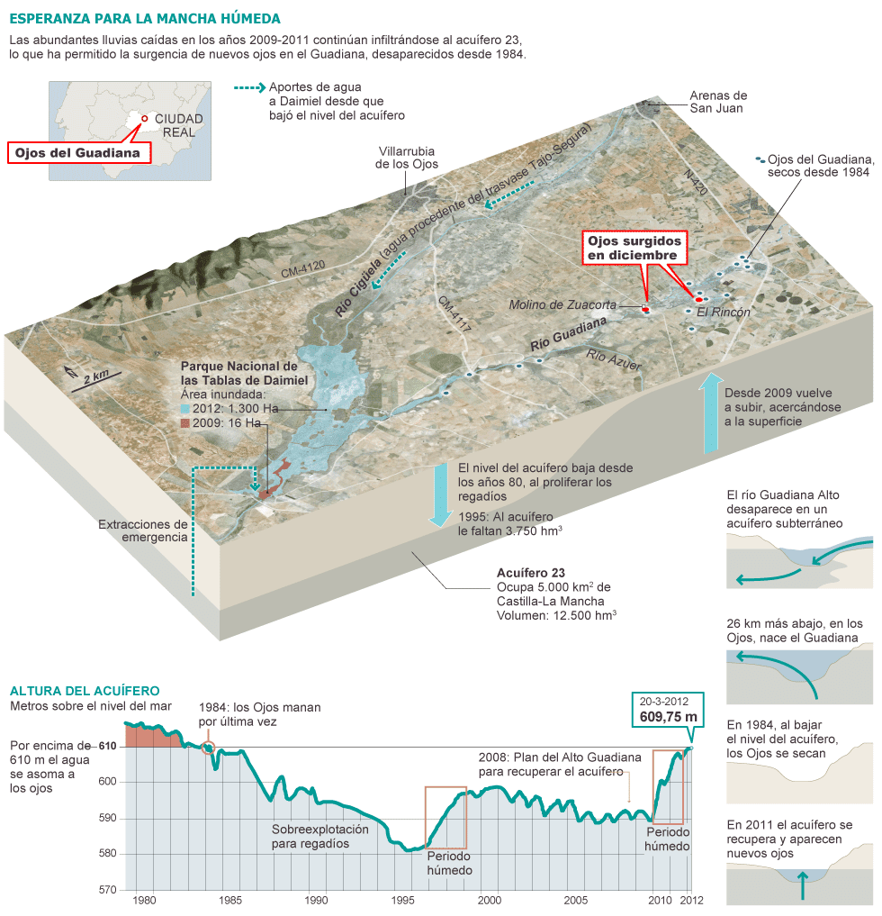 - Al mismo tiempo, el relieve influye en la capacidad erosiva de los ríos. Cuanto mayor sea la pendiente (el desnivel, o diferencia de altitud, entre donde discurre un río y el nivel del mar), mayor es la capacidad erosiva de los ríos. Al contrario, en las zonas llanas o de nula pendiente, las aguas apenas tienen fuerza para llegar al mar, dando lugar al endorreísmo (aguas que no desembocan en el mar). El endorreísmo puede derivar en humedales en el interior peninsular donde apenas hay pendiente, como en zonas de La Mancha.