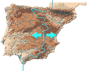 - El basculamiento o inclinación de la península ibérica desde el Terciario hacia el Oeste repercute en la disposición de la red fluvial española, de manera que buena parte de los ríos de España desembocan en el Atlántico. El resultado es una disimetría en la red fluvial, es decir, falta de simetría que presenta la red fluvial.