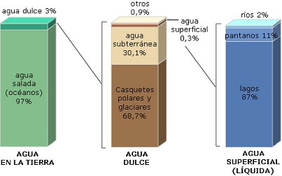 El 80% del agua que se encuentra en los continentes está en la superficie. El 20% restante se encuentra bajo tierra o en forma de vapor de agua atmosférico. Sólo el 3% del agua que existe en la Tierra es agua dulce. De esa cantidad, el 30% se encuentra en depósitos subterráneos y el 1% en ríos y lagos. A pesar de que el agua está distribuida por la Tierra, el 70% de los recursos disponibles de agua dulce del planeta están en la Antártida.